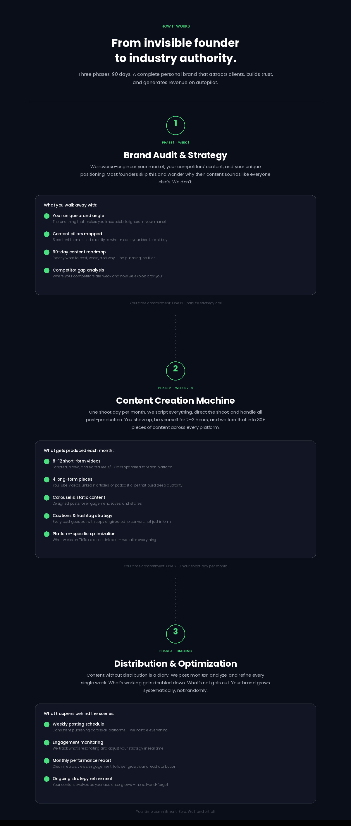 Every founder we work with gets a full-stack personal brand system. Strategy, content creation, filming direction, editing, and distribution — all handled by our team so you can focus on running your business.